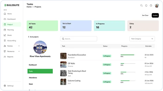 BuildSuite is purpose-built for construction. Unlike task-based tools, it supports BOQ-based planning, site updates, labour and material tracking, and project-wise financial visibility with workflows designed for engineers, supervisors, and operations teams.